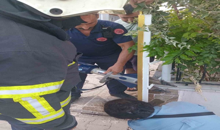 Hatay’da demir kapının korkuluklarına sıkışan yavru köpeği itfaiye kurtardı.
