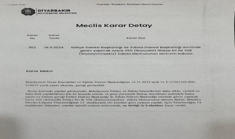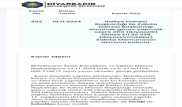 Personel fazlalığı nedeniyle 2016 yılından sonra alınan sözleşmeli memurlara iş akitlerinin 31 Aralık tarihinde fesh edileceği tebliğ edilirken, 478 yeni sözleşmeli memur alımı için meclis kararı ortaya çıktı. Diyarbakır Büyükşehir Belediye Başkanlığı meclis kararlarında İtfaiye Dairesi Başkanlığı ile Zabıta Dairesi Başkanlığı emrinde görev yapmak üzere 250 itfaiye eri ile 228 zabıta memurunun alımının kabul edildiği belirtildi. Kararda, “Belediyemiz İnsan Kaynakları ve Eğitim Dairesi Başkanlığının 14.11.2024 tarih ve E-21361168-000-210675 sayılı yazısı okundu, gereği görüşüldü. Konu üzerinde yapılan görüşmede; belediyemiz itfaiye ve zabıta hizmetlerinin daha etkin, verimli ve daha hızlı yapılabilmesi için bu konuda uzman ve genç personele ihtiyaç duyulması nedeniyle kamu yararı ve hizmet gereği İtfaiye Dairesi Başkanlığı ile Zabıta Dairesi Başkanlığı emrinde görev yapmak üzere 250 itfaiye eri ile 228 zabıta memurunun alımına ilişkin; Belediye Meclisi Çalışma Yönetmeliğinin 13. maddesinin (b) bendine göre oylama yapıldı. Aynı Yönetmeliğin 14. maddesine istinaden; yapılan işaretli oylama neticesinde, oy birliği ile kabulüne karar verildi” denildi.