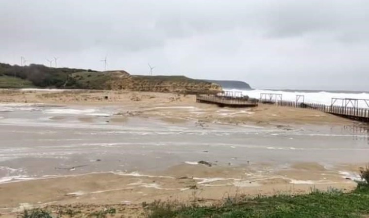 Kırklareli’nin Vize ilçesi Kıyıköy Beldesi’nde 18 Kasım Cumartesi akşamı başlayan ve bugün devam eden yağışlar sonucu Kıyıköy plaj bölgesinde deniz taştı. Yüksek dalgalar nedeniyle plajda bulunan yürüme alanı hasar görürken deniz ile Pabuç Dere birleşti.