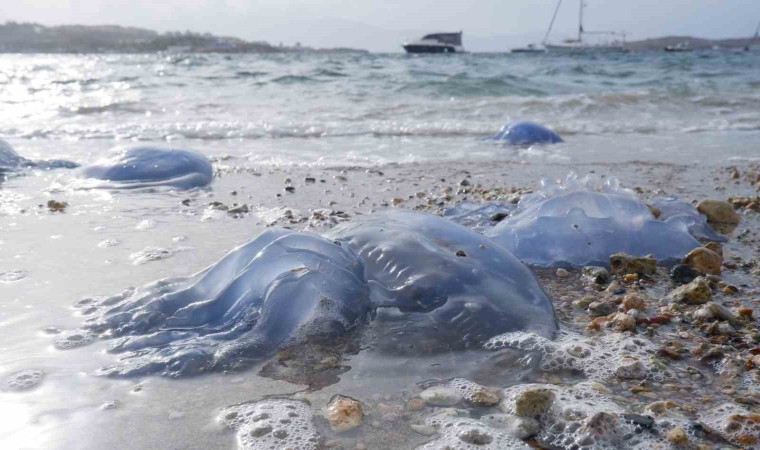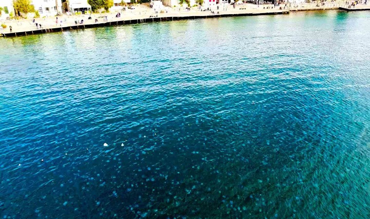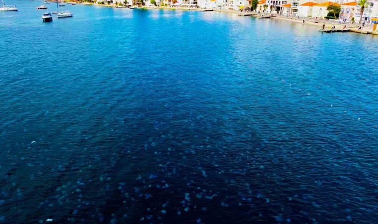İzmir’in turistik ilçesi Foça’da aylardır devam eden denizanası istilası sürüyor. Yağmur ve rüzgarın da etkisiyle sahile doğru ilerleyen binlerce denizanası havadan görüntülendi.