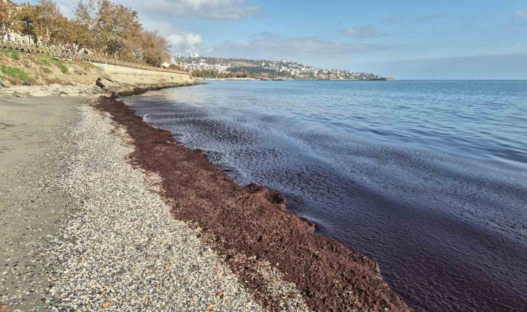 Poyraz fırtınasının ardından Tekirdağ sahilleri, kıyıya vuran kırmızı yosunlarla dikkat çekici bir manzara oluşturdu.