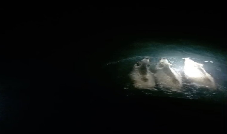 Kastamonu’nun İnebolu ilçesinden dün akşam saatlerinde denize açılan balıkçı Recep Yılmaz, Eyrik köyü açıklarında 3 yavru yaban domuzunun yüzdüğünü gördü.Recep Yılmaz bir yandan o anları cep telefonu ile görüntülerken bir yandan da fener ile ışık tutarak domuzların karaya ulaşmasına yardım etti.