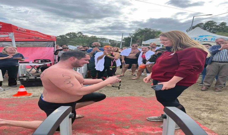Datça ilçesinde bu yıl 18’incisi düzenlenen kış açık deniz yüzme maratonuna İstanbul’dan katılan yüzme antrenörü Kaan Peyami Orhan, 3 bin metrelik parkuru tamamladıktan sonra sahile geldiğinde anons yapan görevliye kız arkadaşına evlilik teklifi yapacağını ve yarış bitiş alanına davet etmesini istedi.