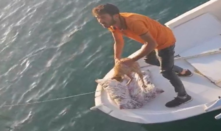 Ordu’nun Fatsa İskelesi’nde denize düşerek mahsur kalan kedi, amatör balıkçılar tarafından kayık yardımıyla kurtarıldı.
