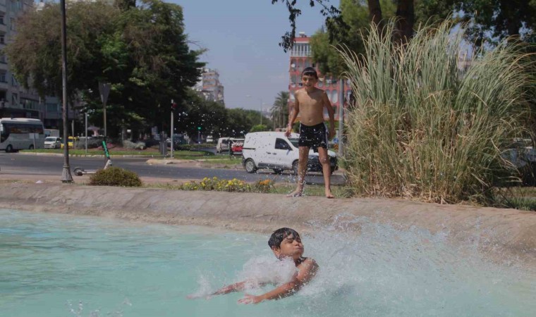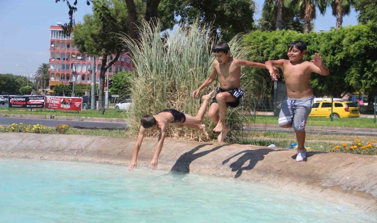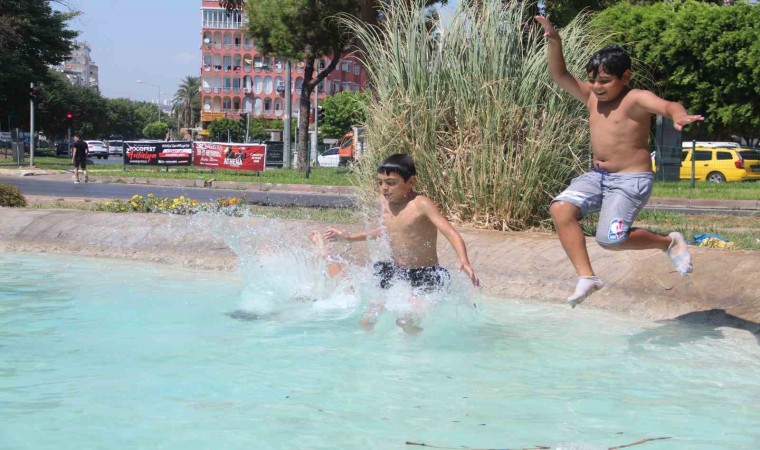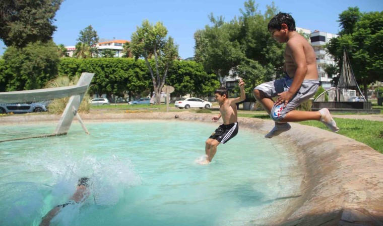 Sıcak ve nemli havanın etkili olduğu Antalya’da, denize gidemeyen çocuklar tehlikeye rağmen mahalle aralarındaki süs havuzlarında serinliyor.