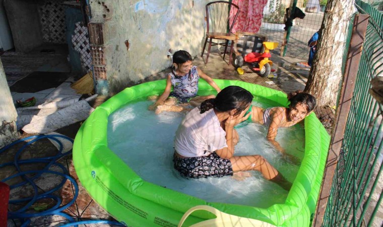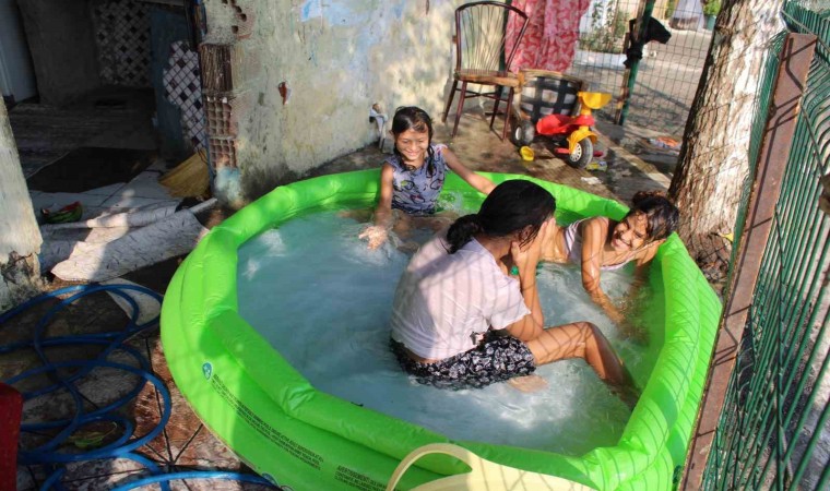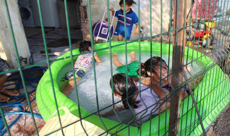 Türkiye’nin en sıcak illerinden olan Aydın’da sıcaktan bunalan vatandaşlar serinlemek için farklı yöntemler bulmaya çalışırken, Efeler ilçesi Ilıcabaşı Mahallesi’nde yaşayan Arzu Özen, çocukları için alternatif çözüm buldu. Evinin önündeki kaldırımı çitle çevirerek güvenlik önlemi alan anne Özen, koyduğu şişme havuz ile çocuklarının serinlemesini sağladı. Plastik havuz şişirip, içini su dolduran anne, çocuklarının serinlemesi için oyun alanı oluşturdu.