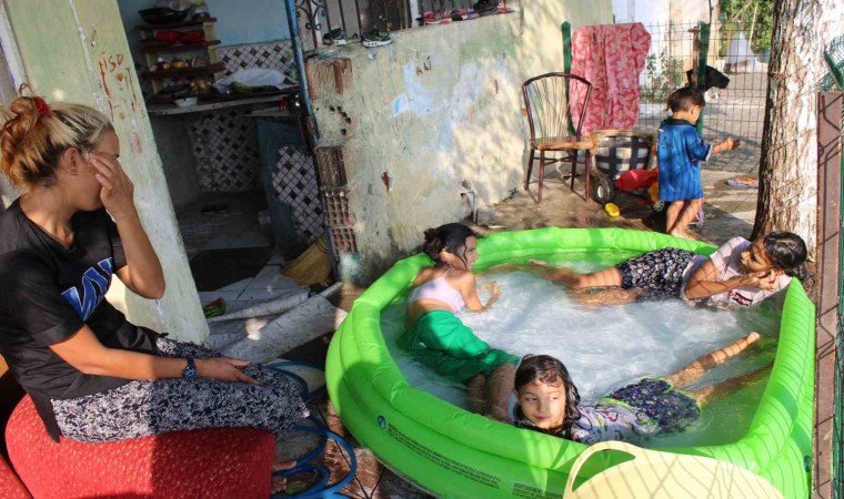 Aydın’ın Efeler ilçesinde yaşayan 5 çocuk annesi Arzu Özen, sıcaklardan bunalan çocukları için alternatif bir çözüm geliştirdi. Evinin önüne koyduğu şişme havuz ile çocuklarının serinlemesini sağlayan anne “Aydın çok sıcak bir memleket, bizim de havuza ya da denize gidecek durumumuz olmadığı için böyle bir çözüm buldum” dedi.