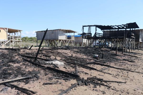 Adem AKALAN/ANTALYA, (DHA)- ANTALYA'da 5 yıldızlı otellere komşu denize sıfır inşa edilen çardaklardan 4'ü dün akşamki yangında küle dönerken, 1'i hasar gördü. Yaz sezonu başlamadığı için kimsenin yerleşmediği çardakların son durumu gün ağardığında ortaya çıktı. Yangının çıkış nedeniyle ilgili polis ve itfaiye inceleme yaparken, 'Nesli tükenme tehlikesindeki deniz kaplumbağalarının yuvalama alanı' ilan edilen sahilde sayıları 700'ü bulan çardakla ilgili yıkım kararı ise henüz uygulanmadı. Yaklaşan sezon öncesi çardakların akıbetinin ne olacağı belirsizliğini koruyor.