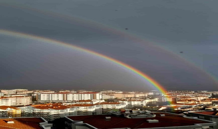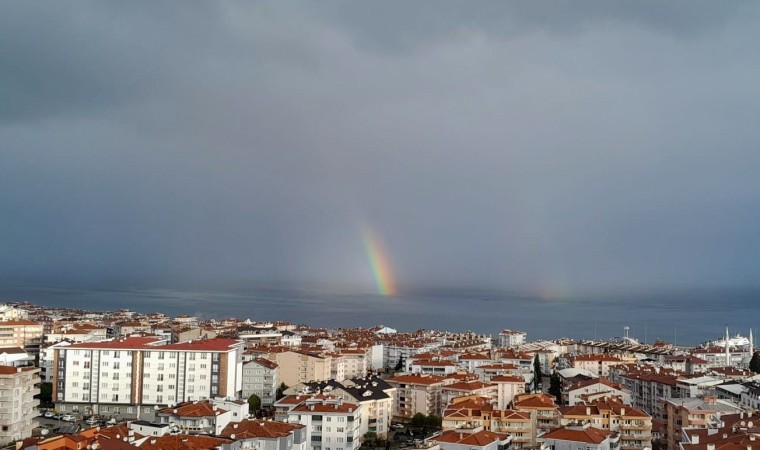 Bursa’nın Mudanya ilçesinde geceden beri etkili olan yağış sabah saatlerinde de devam etti. Bir ara yağmurunu dinmesiyle birlikte bulutların arasından kendini gösteren güneşle birlikte gökkuşağı oluştu. Denizin ortasında beliren gökkuşağının kartpostallık görüntüsü amatör fotoğrafçı Yeliz Portakal tarafından cep telefonu ile kaydedildi. Bulutların güneşi kapatmasıyla gökkuşağı kısa bir süre sonra kayboldu.