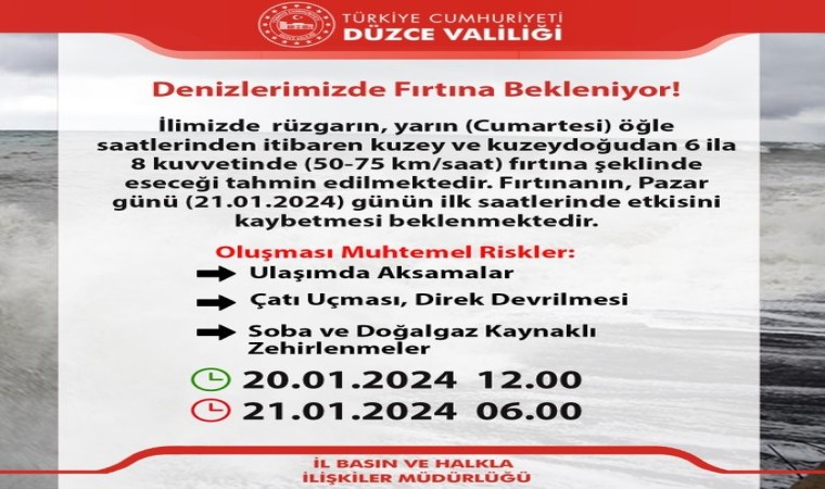 Düzce Valiliği’nden yapılan uyarıda, “İlimizde rüzgarın Cumartesi öğle saatlerinden itibaren kuzey ve kuzeydoğudan 6 ila 8 kuvvetinde (50-75 km/saat) fırtına şeklinde eseceği tahmin edilmektedir. Fırtınanın, Pazar günü (21.01.2024) günün ilk saatlerinde etkisini kaybetmesi beklenmektedir” denildi.