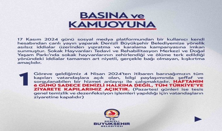 Denizli Büyükşehir Belediyesinden yapılan yazılı açıklamada, 17 Kasım 2024 günü sosyal medya platformundan bir kullanıcının kendi hesabından canlı yayın yaparak, Denizli Büyükşehir Belediyesine yönelik asılsız iddialar üzerinden yıpratma ve karalama kampanyasına imkan sunduğu belirtildi. Söz konusu paylaşımı yapan kişilerin hayvanlara bakmadığı için işten çıkartılan bir personel olduğuna dikkat çekilen açıklamada, Sokak Hayvanları Tedavi ve Rehabilitasyon Merkezi ve Doğal Yaşam Parkında sokak hayvanlarının zehirlendiği ve ölüme terk edildiği yönündeki iddialar tamamen art niyetli, gerçekle bağı olmayan, kışkırtma amaçlı olduğu kaydedildi.