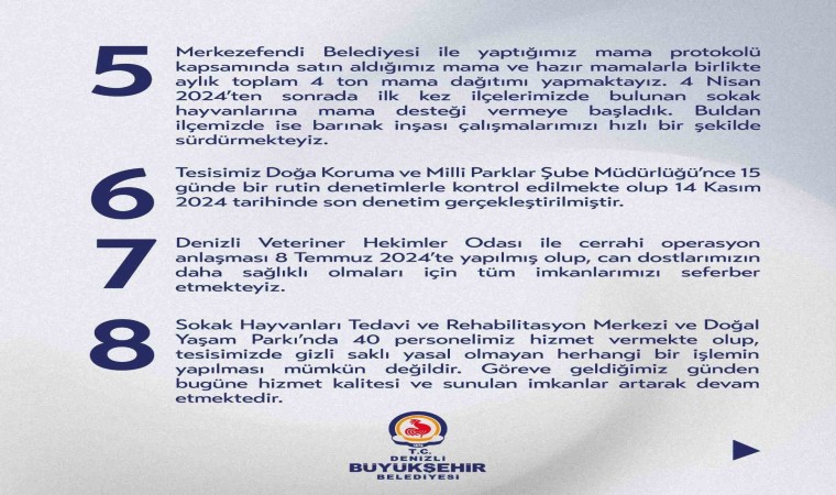 Merkezefendi Belediyesi ile yaptığımız mama protokolü kapsamında satın aldığımız mama ve hazır mamalarla birlikte aylık toplam 4 ton mama dağıtımı yapmaktayız. 4 Nisan 2024’ten sonrada ilk kez ilçelerimizde bulunan sokak hayvanlarına mama desteği vermeye başladık. Buldan ilçemizde ise barınak inşası çalışmalarımızı hızlı bir şekilde sürdürmekteyiz. Tesisimiz Doğa Koruma ve Milli Parklar Şube Müdürlüğü’nce 15 günde bir rutin denetimlerle kontrol edilmekte olup 14 Kasım 2024 tarihinde son denetim gerçekleştirilmiştir. Denizli Veteriner Hekimler Odası ile cerrahi operasyon anlaşması 8 Temmuz 2024’te yapılmış olup, can dostlarımızın daha sağlıklı olmaları için tüm imkanlarımızı seferber etmekteyiz.