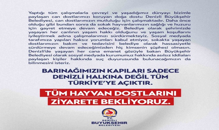 Yaptığı tüm çalışmalarla çevreyi ve yaşadığımız dünyayı bizimle paylaşan can dostlarımızı koruyan doğa dostu Denizli Büyükşehir Belediyesi, can dostlarımızın mutluluğu için çalışmaktadır. Daha önce olduğu gibi bundan sonra da sokak hayvanlarımızın sağlığı ve huzuru için gayret etmeye devam edeceğiz. Belediye olarak şehrimizde yaşayan her canlının yaşam hakkı olduğunu ve yaşam koşullarını iyileştirmek adına çalışmalarımızı sürdürmekteyiz. Sosyal medyada tarafımıza yapılan haksız yorumları kabul etmiyor, sokakta yaşayan dostlarımızın bakım ve tedavisini belediye olarak hassasiyetle sürdürmeye devam edeceğimizden hiç kimsenin şüphesi olmasın. Denizli’de yaşayan her cana emanet gözüyle bakan Büyükşehir Belediyesi olarak sosyal medyada kurumumuz hakkında asılsız iddiaları paylaşan kişiler hakkında suç duyurusunda bulunacağımızın da bilinmesini isteriz. Barınağımızın kapıları sadece Denizli halkına değil tüm Türkiye’ye açıktır. Tüm hayvan dostlarını ziyarete bekliyoruz” ifadelerine yer verildi.