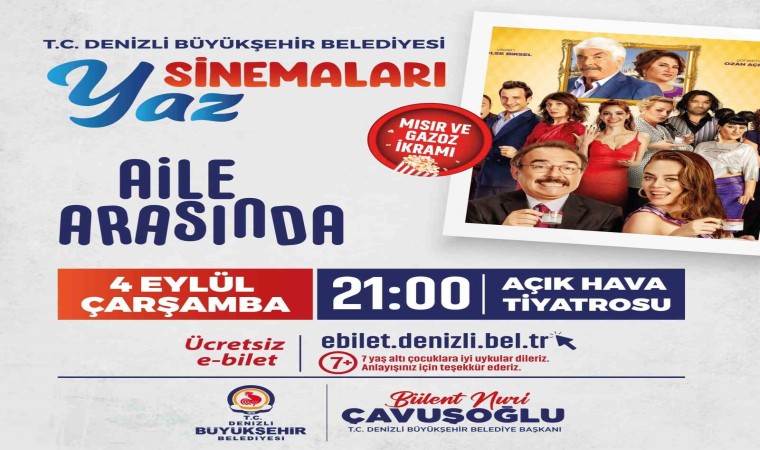 Denizli Büyükşehir Belediyesinin nostaljik sinema gösterimlerini tekrar canlandırdığı açık hava sinema günleri sürüyor. Denizli Büyükşehir Belediyesi Kültür ve Sosyal İşler Dairesi tarafından organize edilen sinema gösterimleri 4 Eylül Çarşamba günü saat 21.00’de “Aile Arasında” ile devam edecek. Engin Günaydın, Demet Evgar, Fatih Artman, Su Kutlu, Gülse Birsel, Ayta Sözeri, Derya Karadaş, Devrim Yakut ve Erdal Özyağcılar gibi isimlerin başrollerde olduğu Türk sinemasının son dönemlerine damga vuran komedi filmi Ziya Tıkıroğlu Açıkhava Tiyatrosu’nda gösterime girecek.