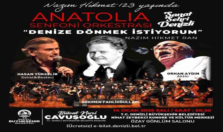 Denizli Büyükşehir Belediyesi, Türk edebiyatının ve dünya şiirinin dev ismi Nazım Hikmet’in 123. yaşını iki özel etkinlikle kutlamaya hazırlanıyor. Edebiyat ve sanatseverler için unutulmaz bir kültür deneyimi sunacak programlar kapsamında ilk olarak 14 Ocak Salı saat 20.30’da Nihat Zeybekci Kongre ve Kültür Merkezi Özay Gönlüm Salonu’nda Anatolia Senfoni Orkestrası’nın sahne alacağı “Denize Dönmek İstiyorum” adlı konserde usta solist ve besteci Hasan Yükselir’in yorumları sanatseverlerle buluşacak. Ünlü tiyatrocu Orhan Aydın’ın anlatımıyla zenginleşecek program, orkestra şefi Gökmen Fahlıoğulları’nın yönetiminde hayata geçirilecek.