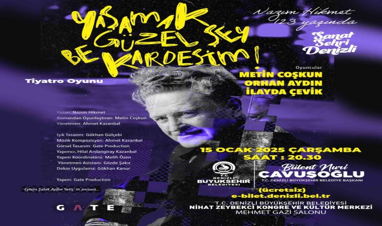 15 Ocak Çarşamba akşamı saat 20.30’da ise Nazım Hikmet’in “Yaşamak Güzel Şey Be Kardeşim” adlı romanından uyarlanan tiyatro oyunu izleyiciyle buluşacak. Metin Coşkun, Orhan Aydın ve İlayda Çevik’in rol aldığı oyun, izleyenlere hayat, umut ve mücadele dolu bir hikaye sunacak. Yönetmenliğini Ahmet Kazanbal’ın üstlendiği bu eşsiz eser, usta sanatçı Eylem Şafak Aydın Yetiş’in anısına Nihat Zeybekci Kongre ve Kültür Merkezi Mehmet Gazi Salonu’nda sahnelenecek. Her iki etkinliğin de ücretsiz olduğu, vatandaşların Denizli Büyükşehir Belediyesi e-bilet internet adresinden rezervasyon yaptırabileceği belirtildi.