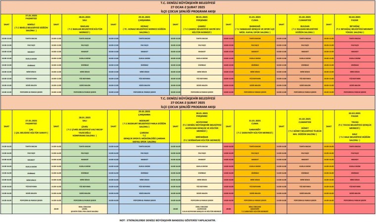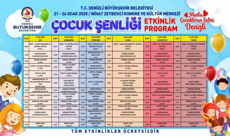Denizli Büyükşehir Belediyesi, sömestr tatilinde çocukların tatil keyfine keyif katacak şenlik programı hazırladı. Program kapsamında 21 Ocak-26 Ocak tarihleri arasında Nihat Zeybekci Kongre ve Kültür Merkezi’nde şenlik düzenlenirken, 27 Ocak-2 Şubat tarihleri arasında ise ilk kez 17 ayrı ilçede çocuklar doyasıya ara tatilin keyfini yaşayacak. Çocuk Şenliği kapsamında boyama atölyelerinden sihirbaz gösterilerine, tiyatro gösterilerinden köpük şovlarına, kukla gösterilerinden VR sanal gerçeklik deneyimleme imkanına, mini diskodan planetaryum gösterimlerine dek birçok etkinlik ve sürprizlerle çocuklar gönüllerince eğlenecek. Şenlikte ayrıca palyaço, tahta bacak, sosis balon dağıtımı, maskot karakterlerle hatıra fotoğrafı çekimi gibi pek çok keyifli aktivite gerçekleştirilecek. Etkinlik boyunca çocuklara pamuk şeker ve patlamış mısır ikramları da Büyükşehir Belediyesi tarafından yapılacak.