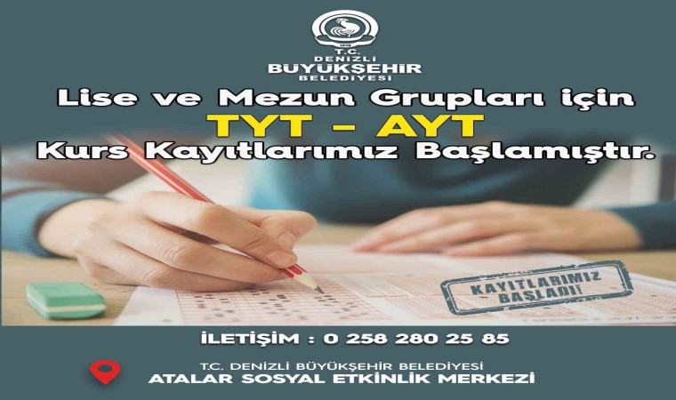 Denizli Büyükşehir Belediyesi Atalar Sosyal Etkinlik Merkezi’nde Lise 10, 11, 12. Sınıf ve mezun durumdaki öğrencilere yönelik TYT(Temel Yeterlilik Testi) ve AYT(Alan Yeterlilik Testi) sınavlarına hazırlık kursu kayıtları başladı. Ücretsiz düzenlenen kurlara öğrenciler Çatalçeşme Oda Tiyatrosu arkasında bulunan Atalar Sosyal Etkinlik Merkezi’nde başvuru formu doldurarak kayıt olabilecekler. Katılımcılar mesai saatleri içerisinde telefonla Atalar Sosyal Etkinlik Merkezi’ni arayarak ayrıntılı bilgi alınabilecekler.