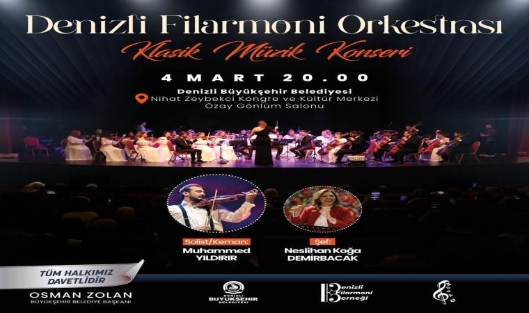 Denizli Büyükşehir Belediyesi, Denizli Filarmoni Derneği işbirliğinde klasik müzik konseri düzenleyecek. Denizli Filarmoni Orkestrası’nın sahne alacağı ücretsiz konser 4 Mart Pazartesi akşamı saat 20.00’de Büyükşehir Belediyesi Nihat Zeybekci Kongre ve Kültür Merkezi Özay Gönlüm Salonu’nda yapılacak. Dünyaca ünlü keman sanatçısı Muhammed Yıldırır’ın sahne alacağı konserin şefliğini ise Neslihan Kağa Demirbacak yapacak.