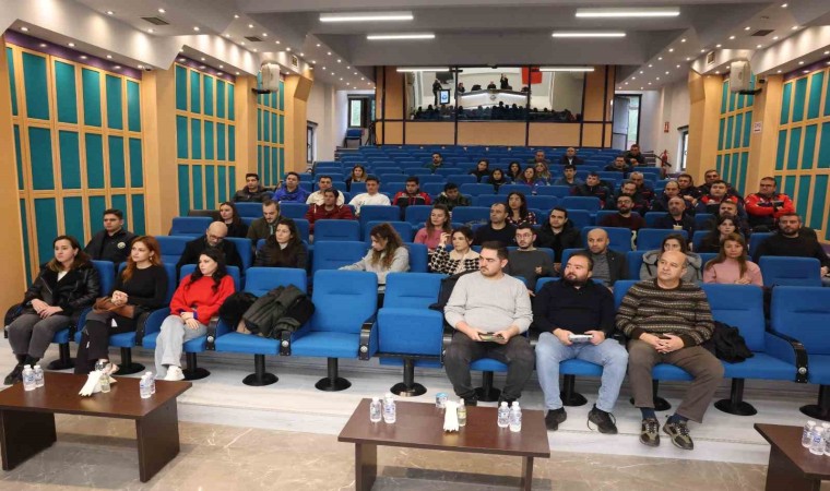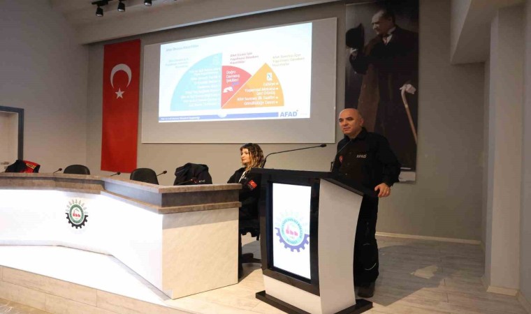 AFAD Afet Acil Durum Yönetim Merkezi Şube Müdürü Hüseyin Elbeyi, eğitimde konuşmacı olarak yer alırken, afet bilinci, afetlere yönelik öncesi, sırası ve sonrasında yapılması gerekenler ile ilgili sunum gerçekleştirdi.