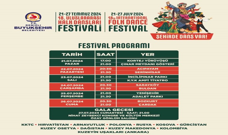 27 Temmuz’a kadar Denizli’ye renk katacak festival programına, “KKTC, Hırvatistan, Arnavutluk, Polonya, Rusya, Kosova, Gürcistan, Kuzey Osetya, Dağıstan, Kuzey Makedonya, Kolombiya, Kuzeyin Uşakları (Ankara) ile ev sahibi Denizli Büyükşehir Belediyesi Konservatuarı Halk Dansları Topluluğu, Denizli Büyükşehir Belediyespor Kulübü Halk Dansları Topluluğu ve 15 Temmuz Şehitler Anadolu Lisesi Spor Kulübü” dans grubları sahne alacak.
