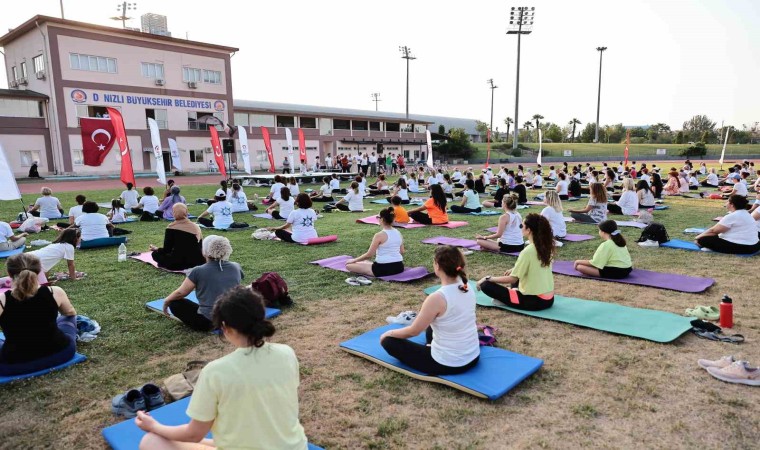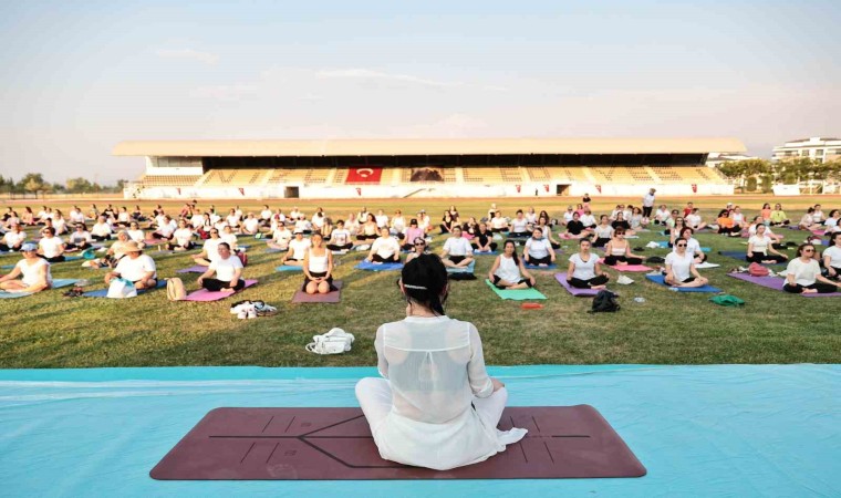 Denizli Büyükşehir Belediyesi spor kurslarında eğitim alan kadınlar, Dünya Yoga Günü etkinlikleri kapsamında hep birlikte yoga yaptı.