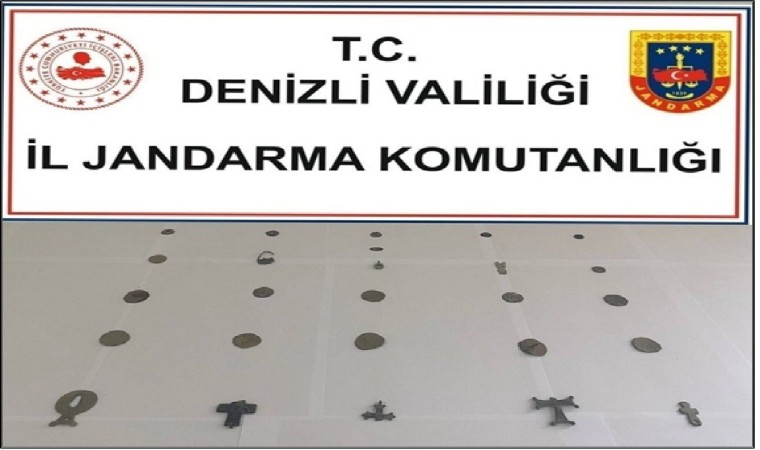 Denizli İl Jandarma Komutanlığı ekiplerince yapılan çalışmalarda, bir şüpheli şahsa yönelik yapılan arama çalışmasında üzerinden 4 adet Bizans ve Selçuklu dönemine ait haç, 18 sikke ve 4 adet obje çıktı.