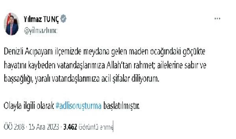Denizli'nin Acıpayam ilçesinde krom madeninde meydana gelen, 1'i mühendis 2 personelin hayatını kaybettiği, 1 kişinin de enkaz altında kaldığı göçük ile ilgili Adalet Bakanı Yılmaz Tunç, açıklama yaptı. Bakan Tunç, sosyal medyadan yaptığı paylaşımda olayla ilgili soruşturmanın başlatıldığını belirterek, "Denizli Acıpayam ilçemizde meydana gelen maden ocağındaki göçükte hayatını kaybeden vatandaşlarımıza Allah’tan rahmet; ailelerine sabır ve başsağlığı, yaralı vatandaşlarımıza acil şifalar diliyorum. Olayla ilgili olarak adli soruşturma başlatılmıştır" ifadelerini kullandı. (DHA)