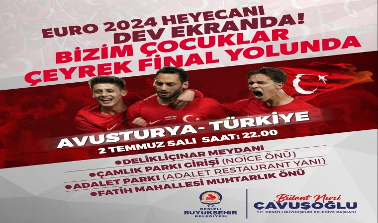 2024 Avrupa Futbol Şampiyonası’nda (EURO 2024) Çekya’yı yenerek son 16’ya kalan A Millî Futbol Takımı, 2 Temmuz 2024 Salı günü saat 22.00’de Avusturya ile karşılaşacak. EURO 2024 futbol coşkusunu kentin dört bir yanında kurduğu dev ekranlara taşımayı sürdüren Denizli Büyükşehir Belediyesi, Avusturya-Türkiye karşılaşmasını da dev ekranlara yansıtacak. Bu kapsamda, Avusturya-Türkiye futbol maçı Delikliçınar Meydanı, Çamlık Parkı girişi, Adalet Parkı ve Fatih Mahalle Muhtarlığı önünde dev ekranlarda izlenebilecek.