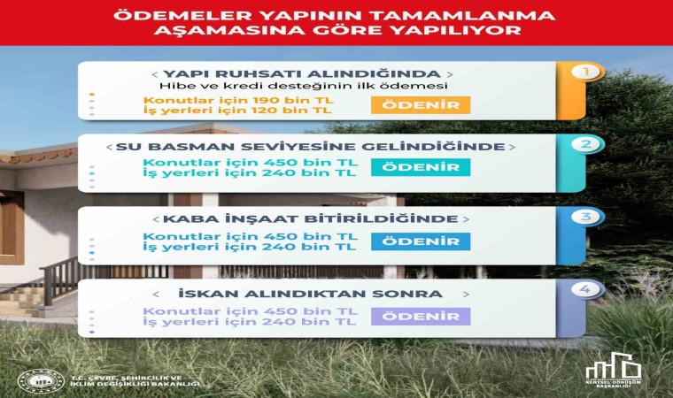 Yapı ruhsatı alındığında, konutlar için hibe ve kredi desteğinin ilk ödemesi 190 bin lira, iş yerleri için 120 bin lira olarak ödeniyor. Su basman seviyesine gelindiğinde; konutlar için 450 bin lira, iş yerleri için 240 bin lira ödeniyor. Kaba inşaat bitirildiğinde; konutlar için 450 bin lira, iş yerleri için 240 bin lira ödeniyor. İskan alındıktan sonra; konutlar için 450 bin lira, iş yerleri için 240 bin lira ödeniyor.
