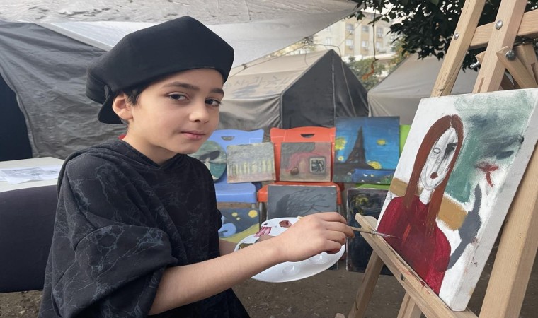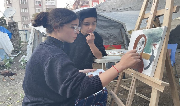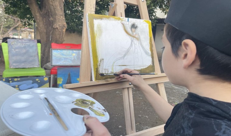 Asrın felaketinde Osmaniye’de ailesiyle birlikte yaşadığı ev ağır hasar alarak yıkılan 10 yaşındaki Medet Mahmut Çardak, evlerinin bahçesinde kurdukları çadırda hayallerini tuvale resmediyor.