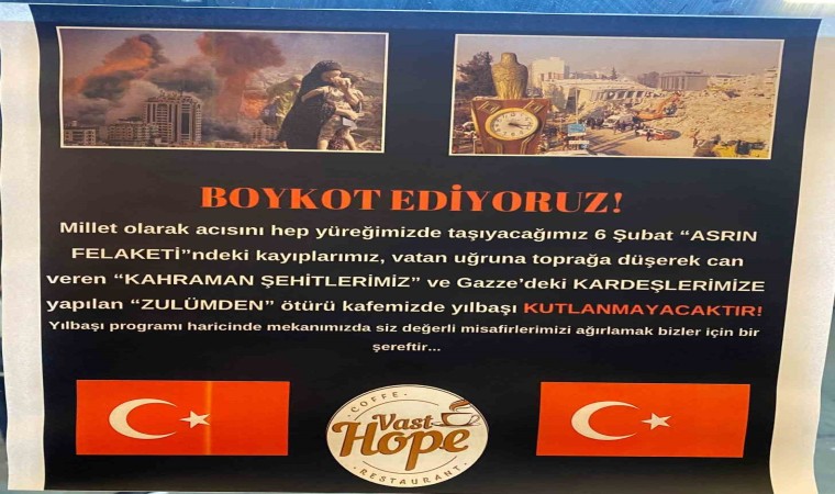 Adıyaman’da bir kafe deprem, şehitler ve Gazze’de yaşanan zulüm nedeniyle yılbaşı kutlama programı yapmayacağını astığı afiş ile duyurdu.