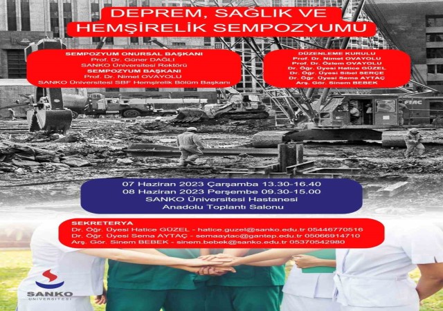 SANKO ÜNİVERSİTESİ SAĞLIK BİLİMLERİ FAKÜLTESİ (SBF) HEMŞİRELİK BÖLÜMÜ TARAFINDAN “DEPREM, SAĞLIK VE HEMŞİRELİK” KONULU SEMPOZYUM DÜZENLENECEK. SANKO ÜNİVERSİTESİ HASTANESİ ANADOLU TOPLANTI SALONUNDA 7-8 HAZİRAN 2023 TARİHLERİNDE DÜZENLENECEK SEMPOZYUMUN AÇILIŞ KONUŞMALARINI REKTÖR PROF. DR. GÜNER DAĞLI, SBF DEKANI PROF. DR. TÜRKAN PASİNLİOĞLU VE SBF HEMŞİRELİK BÖLÜM BAŞKANI PROF. DR. NİMET OVAYOLU YAPACAK.