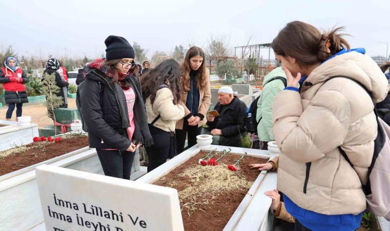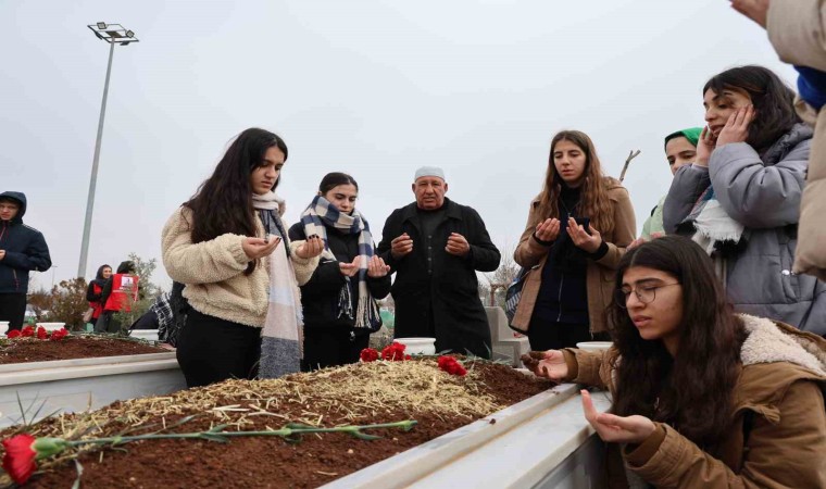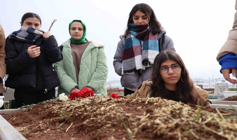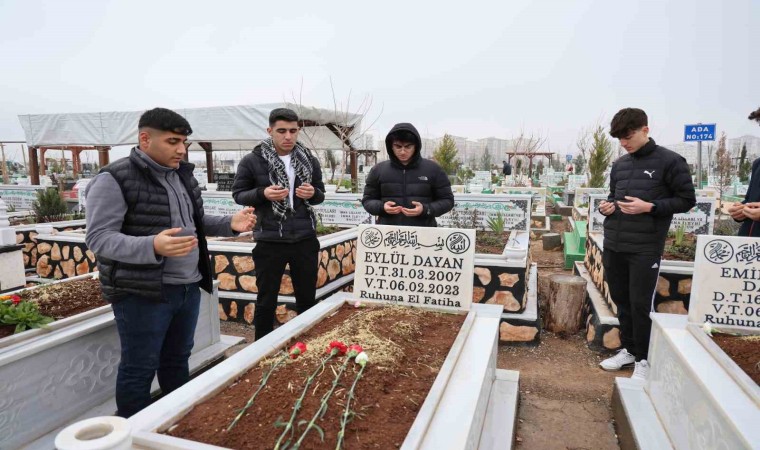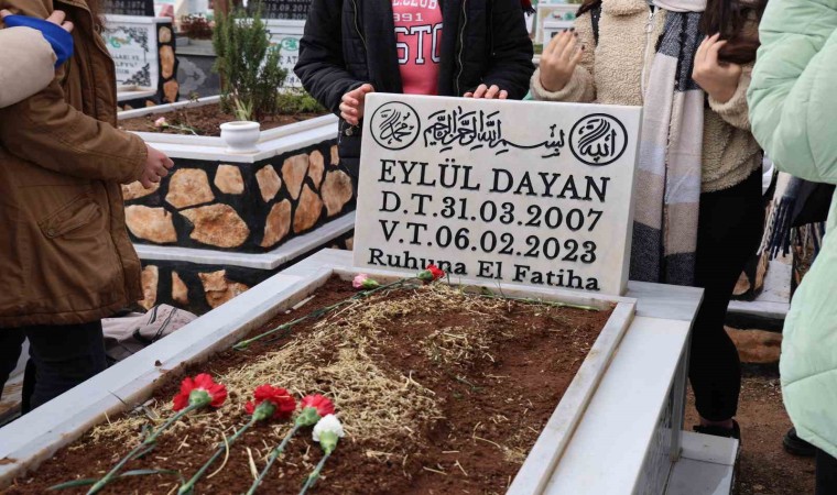 Çapraz, “Depremin 1. yıl dönümü dolayısıyla sınıf arkadaşımız Eylül’ün mezarı başına geldik. Buraya sınıf arkadaşlarımızla geldik. Arkadaşımız Eylül, annesi, babası, ağabeyi ve ablası depremde hayatını kaybetti” dedi.