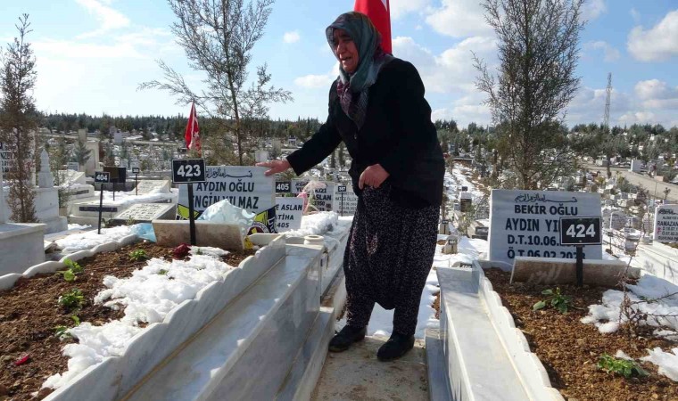 Kahramanmaraş merkezli depremlerde oğlu ve gelini ile iki torununu kaybeden Azet Yılmaz, günün büyük bir bölümünü ailenin defnedildiği şehir mezarlığında geçiriyor. Mezarlığın evi haline geldiğini belirten yaşlı kadın, çocuklarını çok özlediğini söyledi.