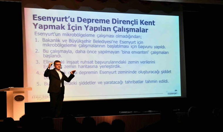 Esenyurt’u depreme hazırlamak ve deprem anında yapılacak çalışmaları belirlemek amacıyla Esenyurt Belediye Başkanı Kemal Deniz Bozkurt tarafından başlatılan Depreme Dirençli Kent Esenyurt programının üçüncü toplantısı ilçedeki okul müdürleri ve öğretmenlerle yapıldı. Esenyurt Kaymakamı Fatih Çobanoğlu ve Esenyurt Üniversitesi Rektörü Prof. Dr. Saadetdin Herdem’in de katıldığı toplantıda Başkan Bozkurt, göreve geldiği günden bu yana ilçede doğal afetlere hazırlık noktasında yapılan çalışmalarla ilgili bir sunum gerçekleştirdi. Prof. Dr. Naci Görür ise Marmara’da beklenen depremin Esenyurt’a yapabileceği olası etkileri anlattı.