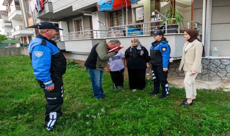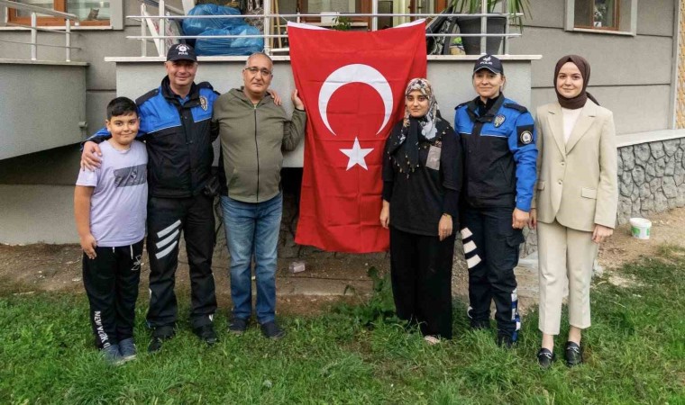 Düzce İl Emniyet Müdürlüğü ile irtibata geçen ve deprem bölgesinden gelerek kentte hayatını devam ettiren Mehmet Gürler, polislerden Türk Bayrağı talep etti. Düzce İl Emniyet Müdürlüğü Toplum Destekli Polislik Şube Müdürlüğü görevlileri Mehmet Gürler’in Türk Bayrağı talebi üzerine aileyi ziyaret ederek Türk Bayrağı’nı teslim ettiler. Polis ekiplerini karşısında görünce mutluluklarını gizlemeyen Gürler ailesi emniyet teşkilatına teşekkür etti.
