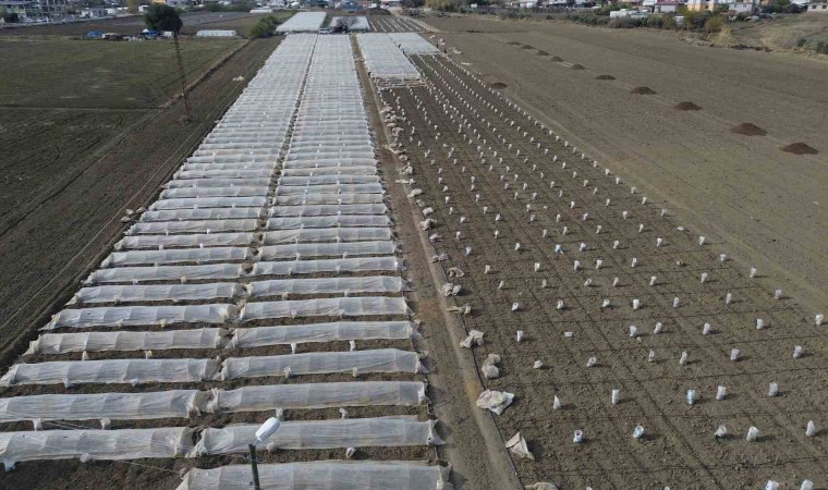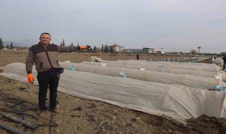 Hatay’ın Antakya ilçesinde 20 dönümlük tarlaya erkenci kabak eken çiftçi Servet Ertaş, mahsulü soğuktan korumak için sera kuruyor. Ertaş, mart ayında yapacağı hasatla kabağı kilosu 50 TL’den satmayı planlıyor.