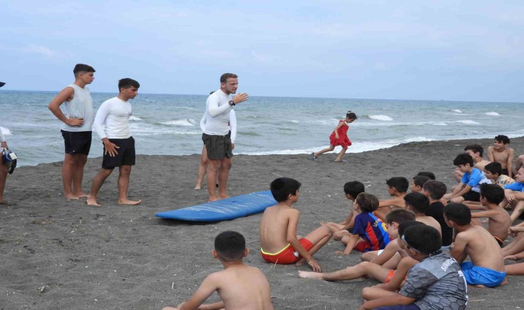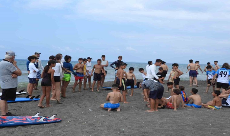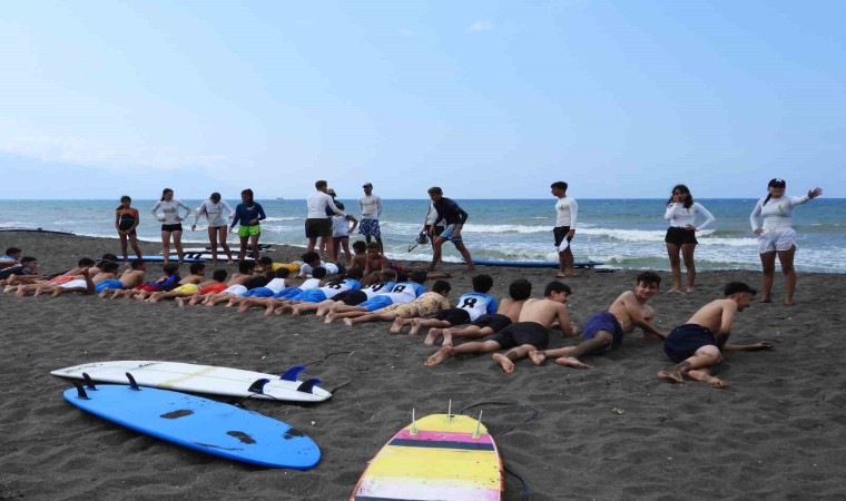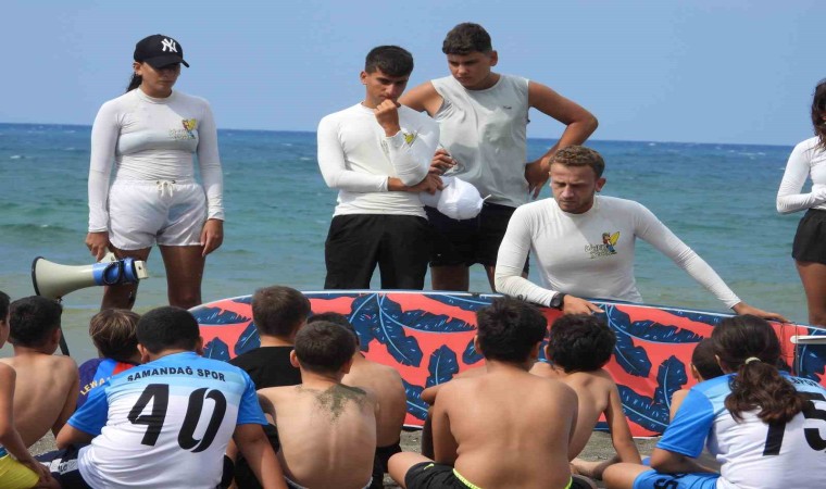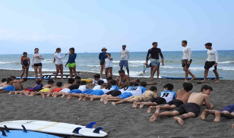 Hatay’ın Samandağ ilçesinde çocuklar, ücretsiz verilen kursta sörf yapmayı öğreniyor.