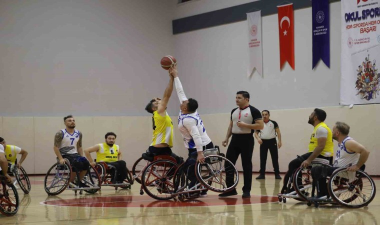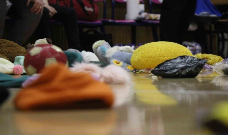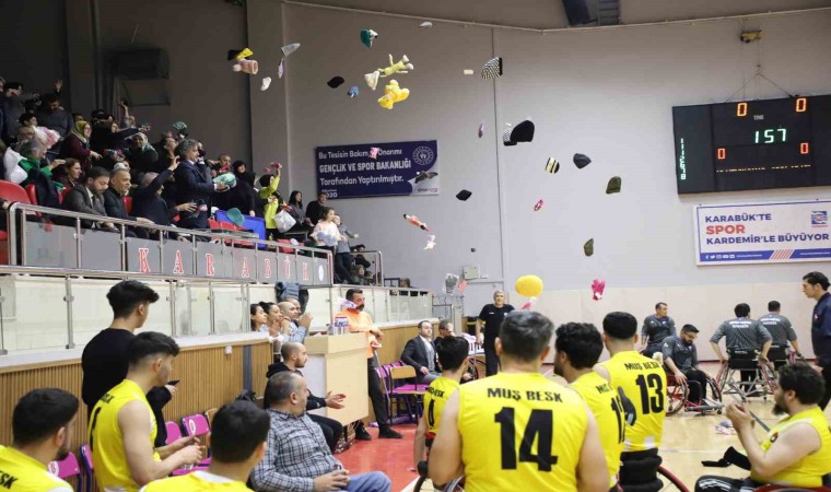 Karabük’te oynanan Tekerlekli Sandalye Süper Ligi karşılaşmasının başlama düdüğünden önce tribünden parkeye depremzede çocuklar için pelüş oyuncak, atkı, bere ve eldiven atıldı.