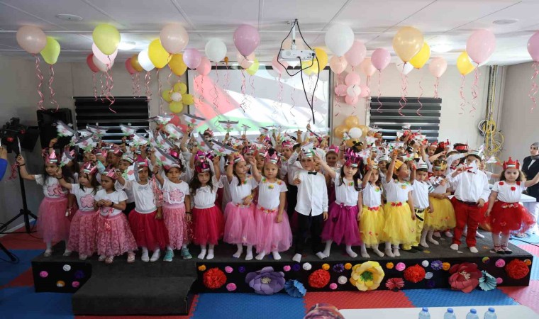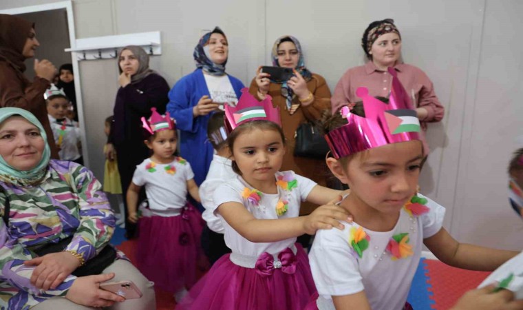Dulkadiroğlu İlçesi Karacasu Konteyner Kentte, Kur’an kursu eğitimi alan 5-6 yaşındaki çocuklar için yılsonu etkinliği düzenlendi. Yıl boyunca Kur’an ve dini eğitimlerini alan çocuklar gösteri yapıp ilahiler söyledi. Etkinlikte çocukların kendi yaptıkları Filistin bayrağı ise dikkat çekti. Ellerinde Ayyıldız ve taçlarının üzerindeki Filistin bayraklarla sahneye çıkan çocuklar Filistin için ilahi söyledi.
