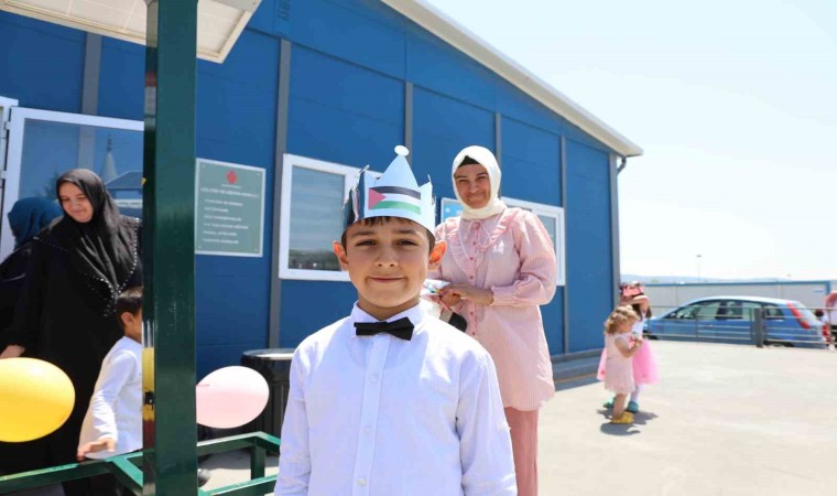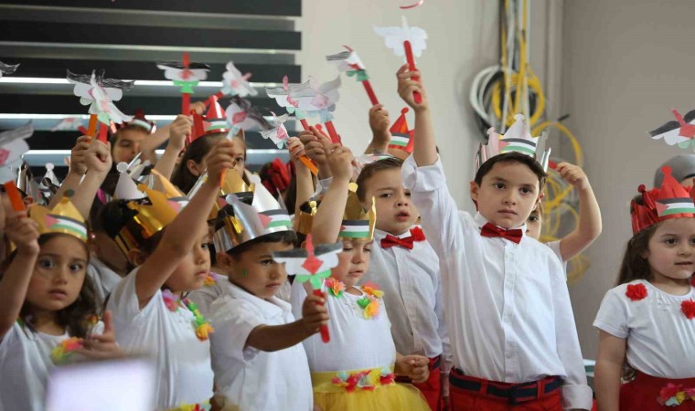 Konteyner kentte bir yıl boyunca eğitim gören minik çocuklar, yılsonu etkinliğinde kendi yaptıkları Filistin bayraklarıyla Filistinlilere destek oldu.