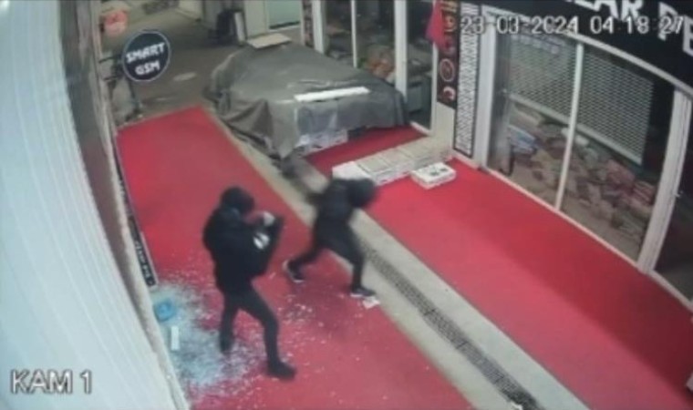 6 Şubat depremlerinde büyük hasar alan illerden biri olan Malatya’da, esnaf için kurulan geçici ticaret merkezinde yaşanan hırsızlık güvenlik kamerasına yansıdı. Büyükşehir Belediyesi yanında bulunan çarşıya gelen yüzü maskeli 2 şüpheli, bir cep telefonu dükkanının önünde beklemeye başladı. Çevreyi gözetlediği görülen 2 şahsın, daha sonra ellerindeki taşla iş yerinin camını kırarak vitrinde bulunan cep telefonlarını alması an güvenlik kameralarına saniye saniye yansıdı.
