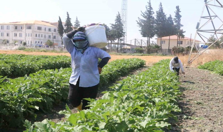 Hava sıcaklığının 50 dereceyi bulduğu enkaz kent Hatay’da kilogram fiyatı tarlada 6 TL’den alıcı bulan patlıcan için tarım işçilerinin zorlu mesaisi devam ediyor.