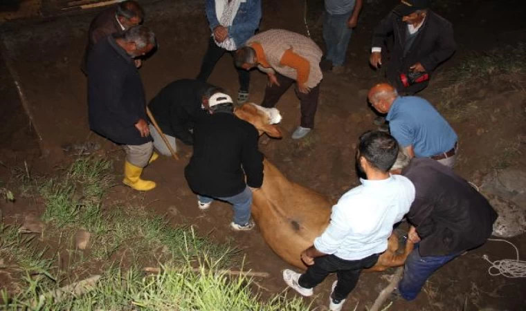 Dere yatağına düşen inek, 5 saatlik çalışma ile kurtarıldı