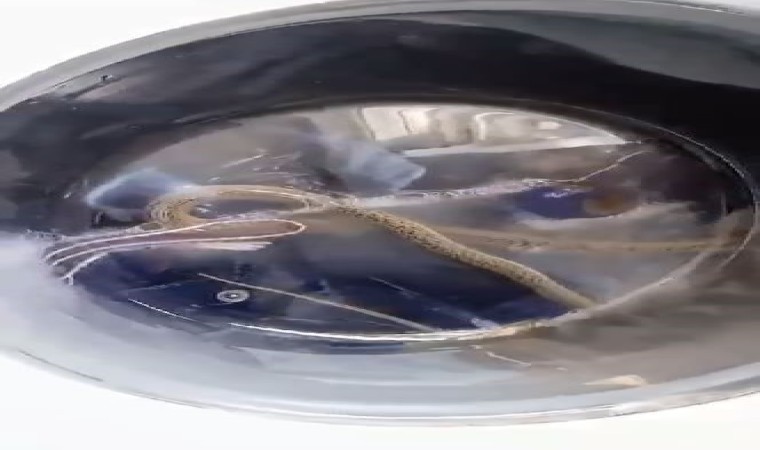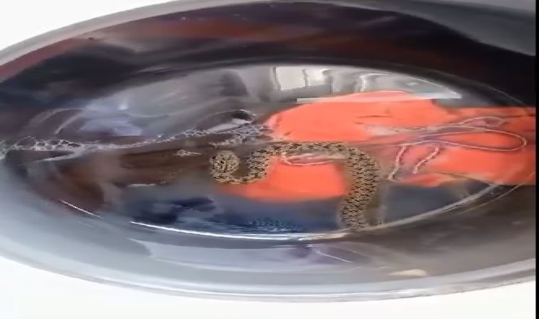 Hakkari’nin Derecik ilçesine bağlı Yeşilova köyünde, eve giren yılan, çamaşır makinesinde görüldü.