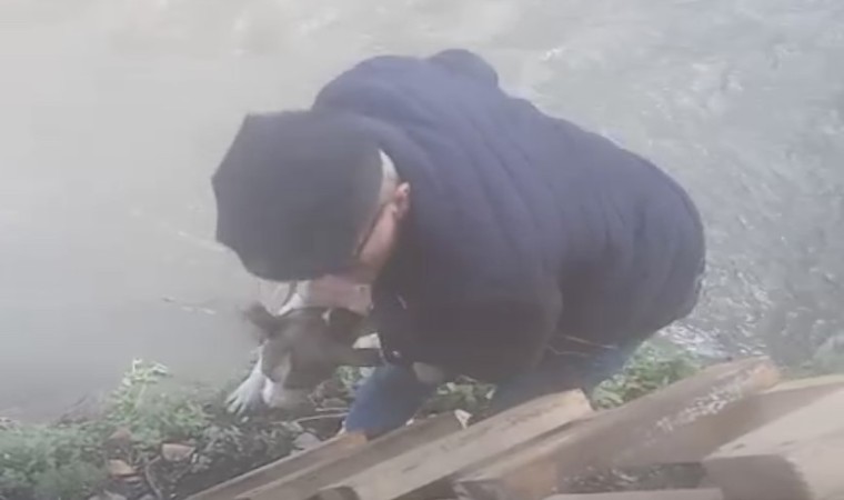 Zonguldak’ta Asma Mahallesinde dereye düşen sokak köpeğini Asma Mahallesi Muhtarı Gürbüz Kuğu kurtardı.