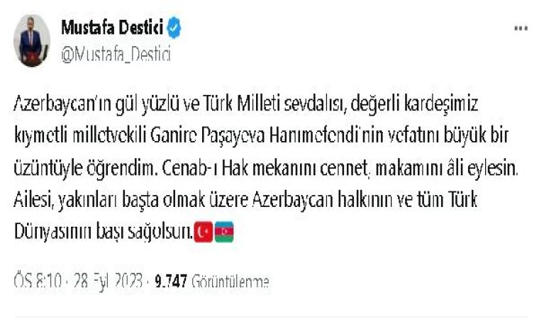 Destici, sosyal medya hesabından yaptığı paylaşımda, "Azerbaycan’ın gül yüzlü ve Türk Milleti sevdalısı, değerli kardeşimiz kıymetli milletvekili Ganire Paşayeva Hanımefendi’nin vefatını büyük bir üzüntüyle öğrendim. Cenab-ı Hak mekanını cennet, makamını âli eylesin. Ailesi, yakınları başta olmak üzere Azerbaycan halkının ve tüm Türk Dünyasının başı sağ olsun" ifadelerine yer verdi. (DHA)