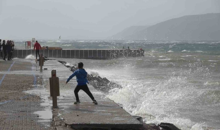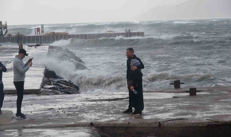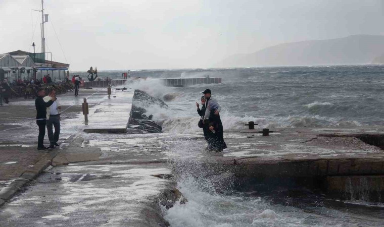 Çanakkale’de saatteki hızı zaman zaman yaklaşık 90 kilometreyi bulan fırtına nedeniyle dev dalgalar kordonboyunda sahili adeta dövdü. Sahile ulaşan dev dağalar eşliğinde fotoğraf çektirmek isteyen vatandaşlar hayatlarını adeta tehlikeye attı. Çanakkale-Eceabat arasında feribot seferi gerçekleştiren Şehid Ömer Halis Demir’in boğazı geçişi sırasında şiddetli rüzgar ve dev dalgalarla mücadelesi görüntülendi.