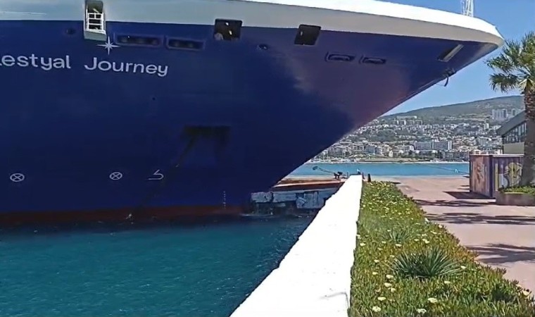Aydın’ın Kuşadası ilçesinde limana yanaşmaya çalışan dev kruvaziyer gemi duramayınca iskeleye çarptı. Çarpmanın etkisi ile iskelede ve gemide maddi hasar oluştuğu öğrenildi. Geminin çarpma anı cep telefonu kamerasına yansıdı.